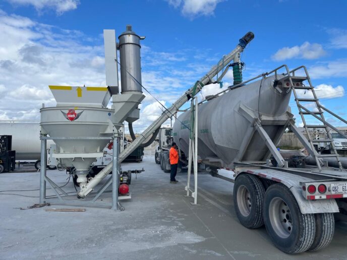 It can unload cement from Big Bags into storage silos or cement bulk trailers.