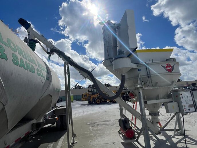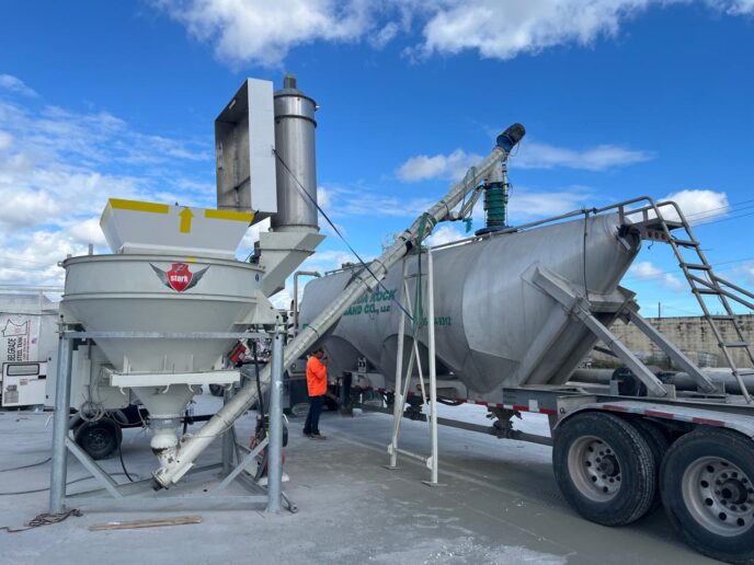 The system features a 3.92cy (3 m³) capacity with a discharge rate of up to 45cy/h (35 m³/h) and a discharge height of up to 14′. It is equipped with an 8″ diameter by 20′ vertical screw conveyor, a side vibrator, and a CE-certified electrical control panel. For enhanced safety and accessibility, the unit includes telescopic legs and stairs with safety rails. Optional features, such as an integrated 150 sf dust collector and a telescopic bellow, are also available to further ensure a clean work environment.